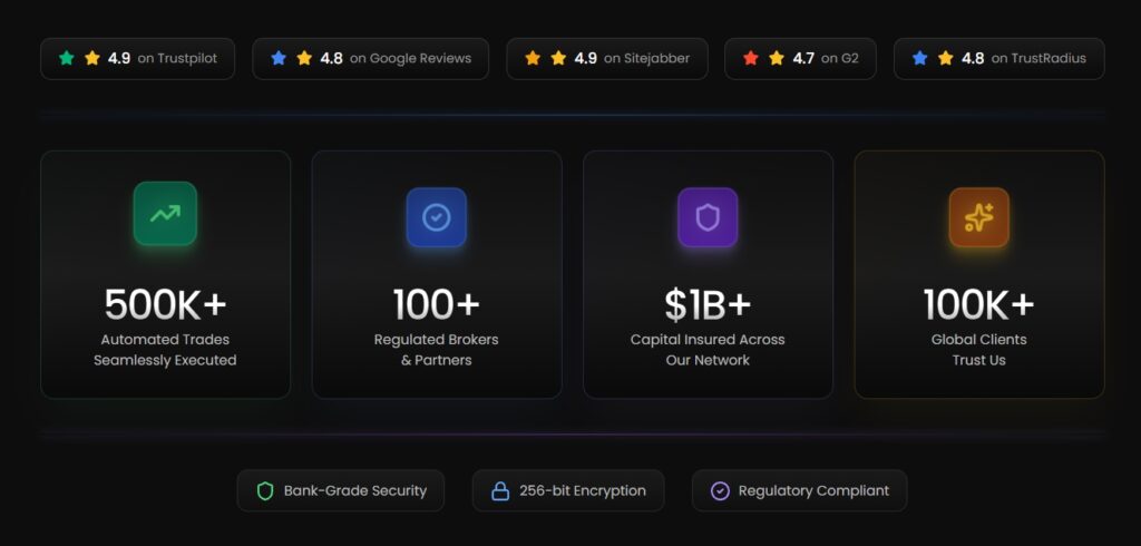 Complementing the marketplace is the automated trade execution system. Trades are executed across Forex, Cryptocurrencies, Commodities, Equities, and Futures at institutional-grade speed. Proprietary algorithms eliminate emotional trading and minimize human error, creating a seamless trading experience for users.